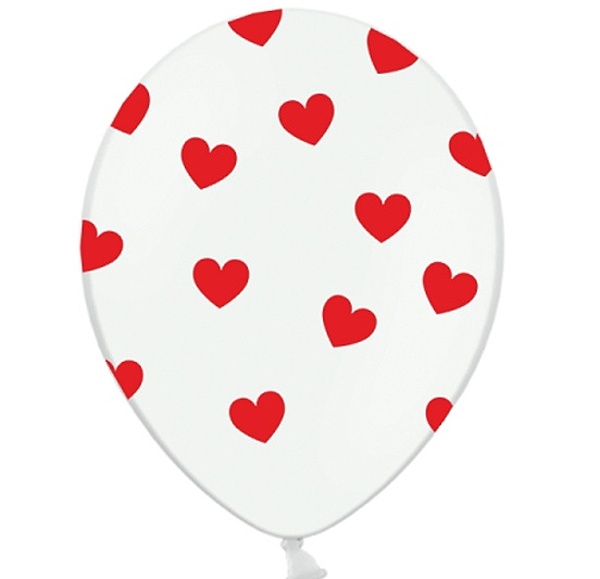 Kvalitný latexový balón priehľadný s červenými srdiečkami.