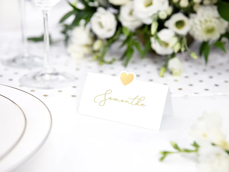 Svadobné menovky na stôl biele so zlatým srdiečkom