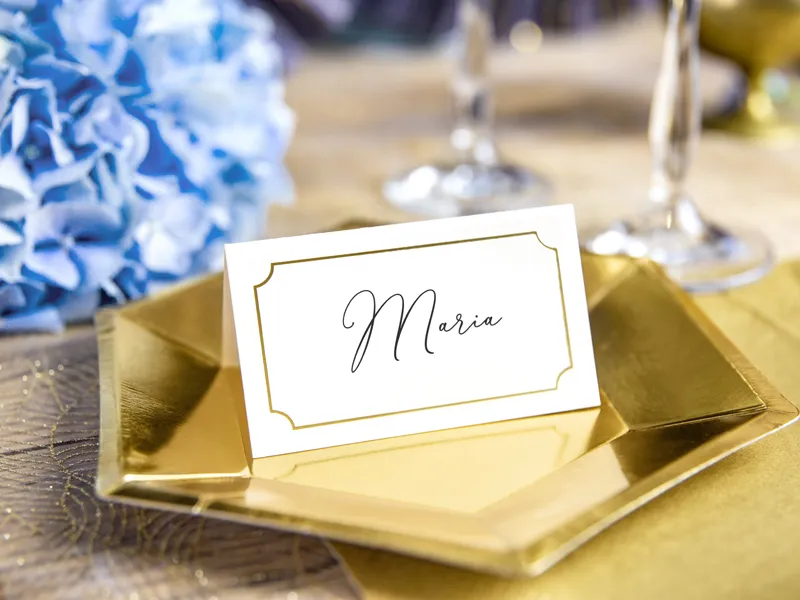 Svadobné menovky na stôl z bieleho papiera so zlatým rámčekom.