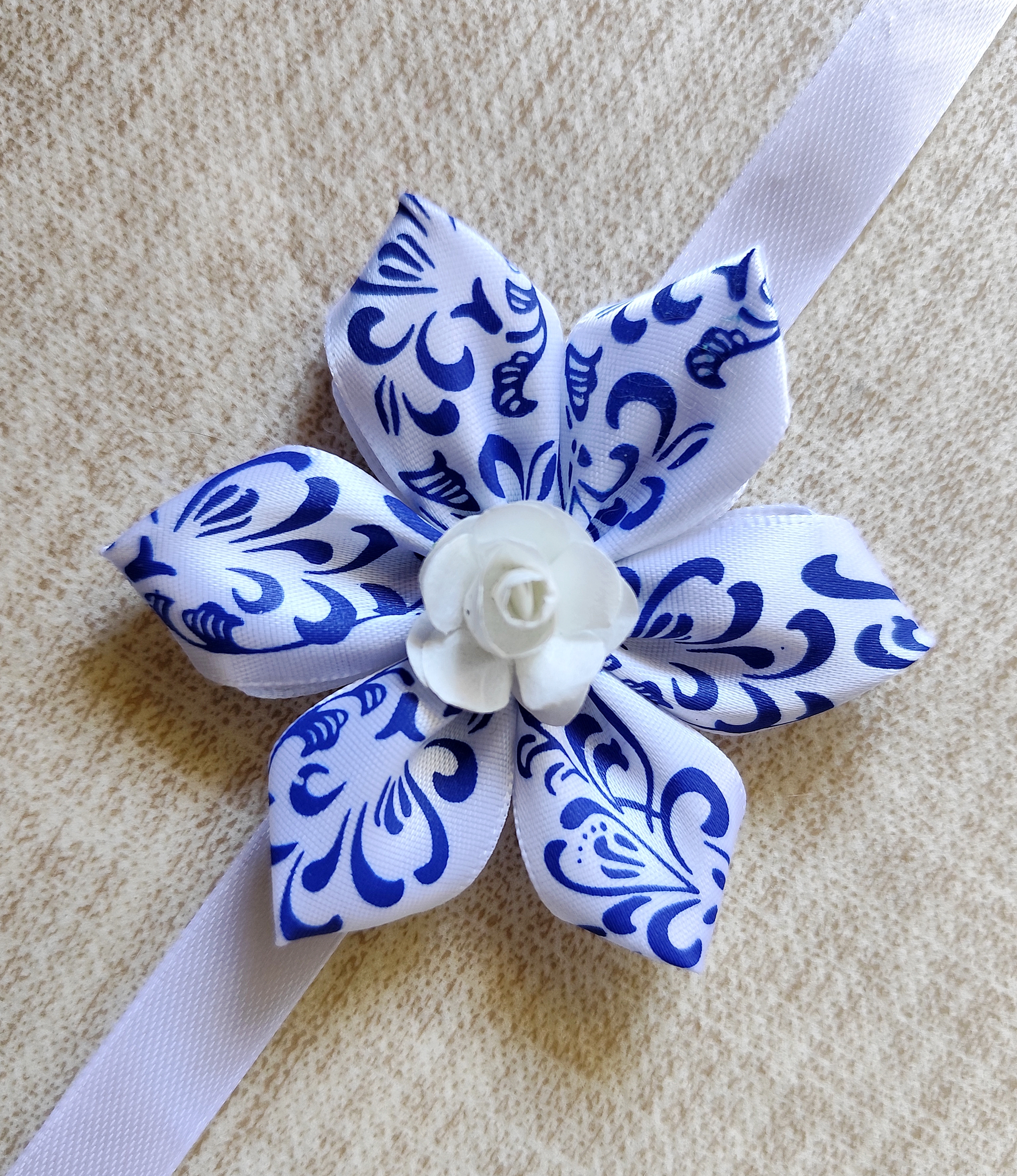 Náramok pre družičku saténovy kvet biely s modrým folklórnym motívom.