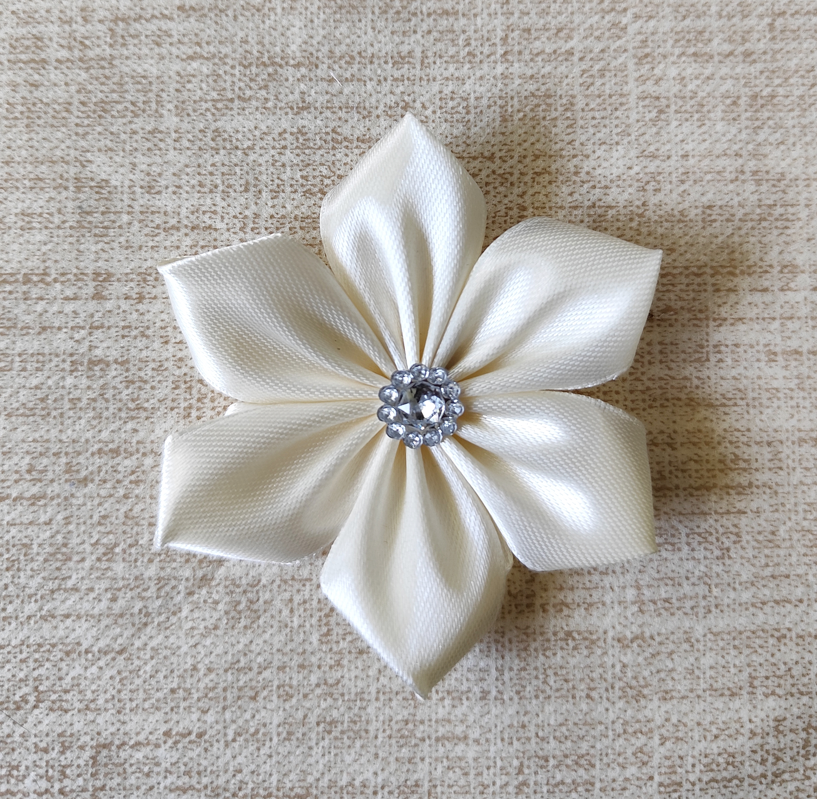 Elegantný krémový saténový kvet s jemným leskom, ideálny na svadobné dekorácie, vlasové doplnky či brošne. Trvácna ozdoba pre vaše tvorivé projekty a slávnostné príležitosti.