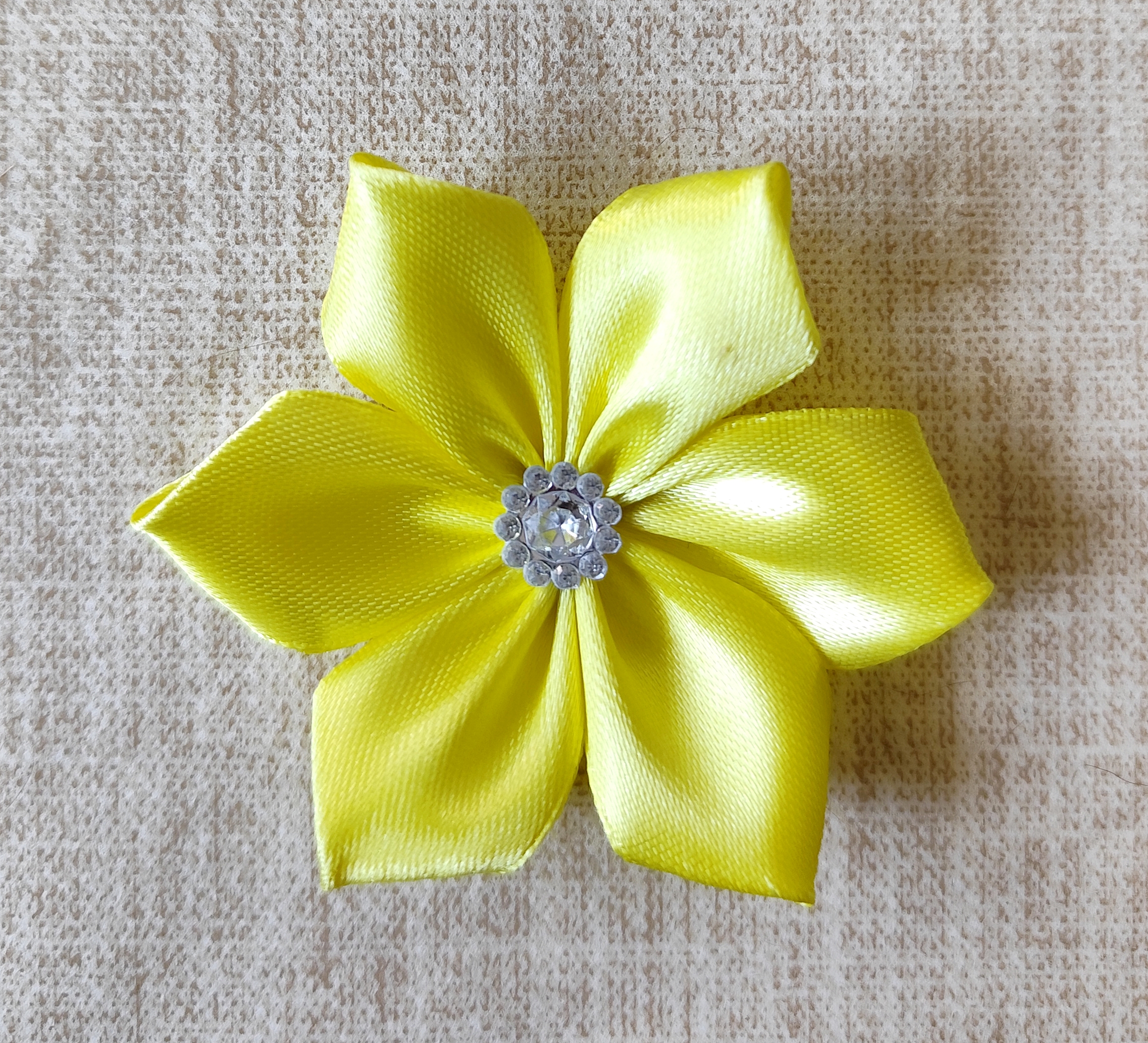Elegantný žltý saténový kvet s jemným leskom, ideálny na svadobné dekorácie, vlasové doplnky či brošne. Trvácna ozdoba pre vaše tvorivé projekty a slávnostné príležitosti.