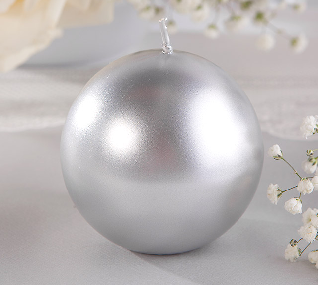 Sviečka guľa metalická strieborná s priemerom 6cm.